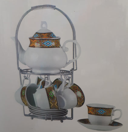 Porcelain Tea Sets Eri/Ethio Series, 8 OZ Cups & Saucer Service for 6, With Tea pot with lid and Metal Stand